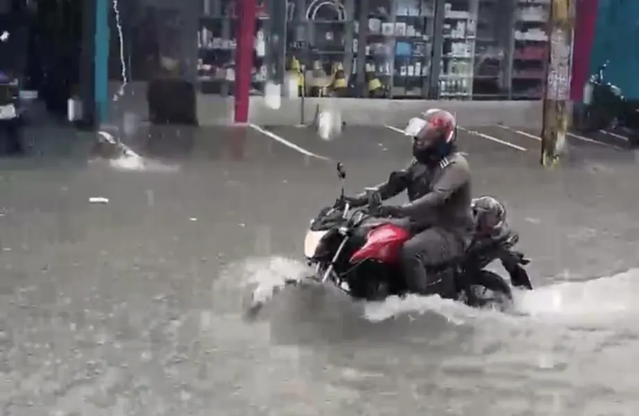 Avenida Francisco Queiroz, no bairro Manoa, fica tomada pela água e vídeo mostra risco enfrentado por motociclista.